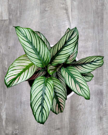 Calathea 'Zebrina', commonly known as the Zebra plant, owes its name to the striking striped pattern on its leaves, reminiscent of a zebra's coat. Originating from the tropical rainforests of Brazil, it embodies the lush and vibrant spirit of its native land, making it a dazzling addition to any plant collection.