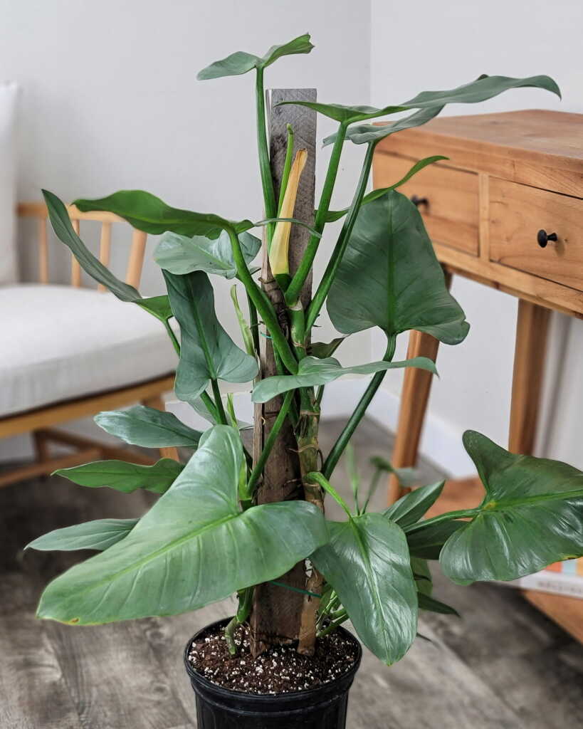 It tends to like more light and humidity than most philodendrons so close to a window or a well-lit area is preferred. This large specimen is already climbing up a totem.