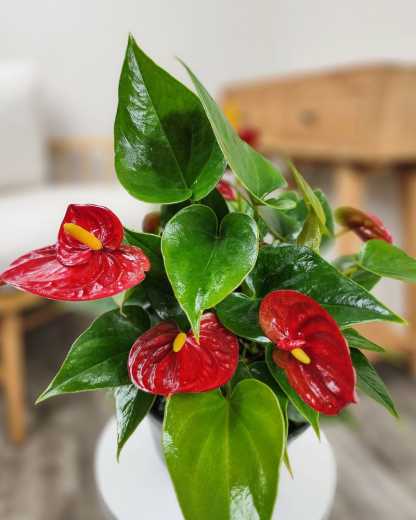 Perfect for adding a bold touch to any indoor space, anthuriums are low-maintenance plants that symbolize hospitality and happiness.
