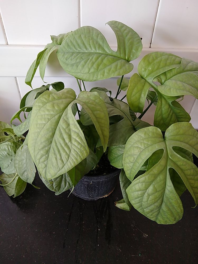 Overview: This one will have your spider senses tingling! Amydrium medium ‘Silver,’ a striking tropical aroid, captivates with its unique silver-green foliage. Originating from the rainforests of Southeast Asia, this plant is known for its elongated, fenestrated leaves that feature a stunning blend of silver and green hues. The intricate leaf patterns create an elegant, almost ethereal appearance, making it a standout addition to any plant collection. This climbing plant can reach heights of 4-6 feet with proper support, making it ideal for trellises or moss poles.