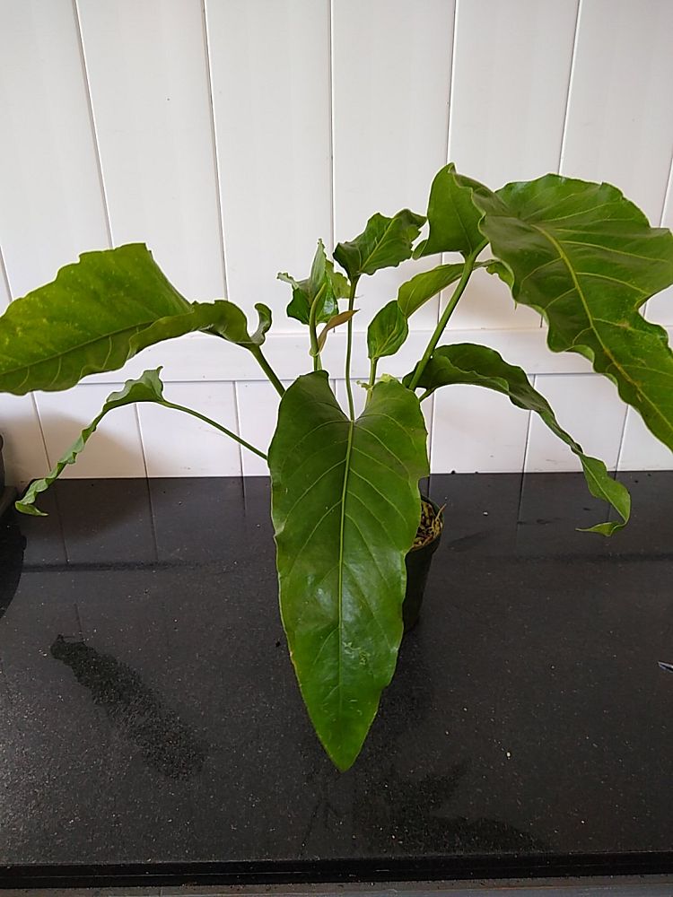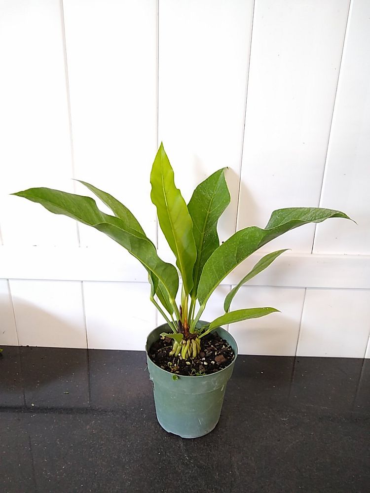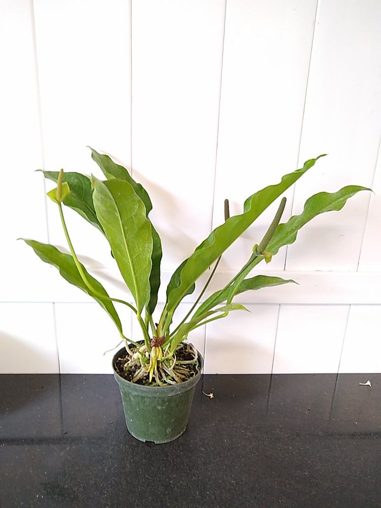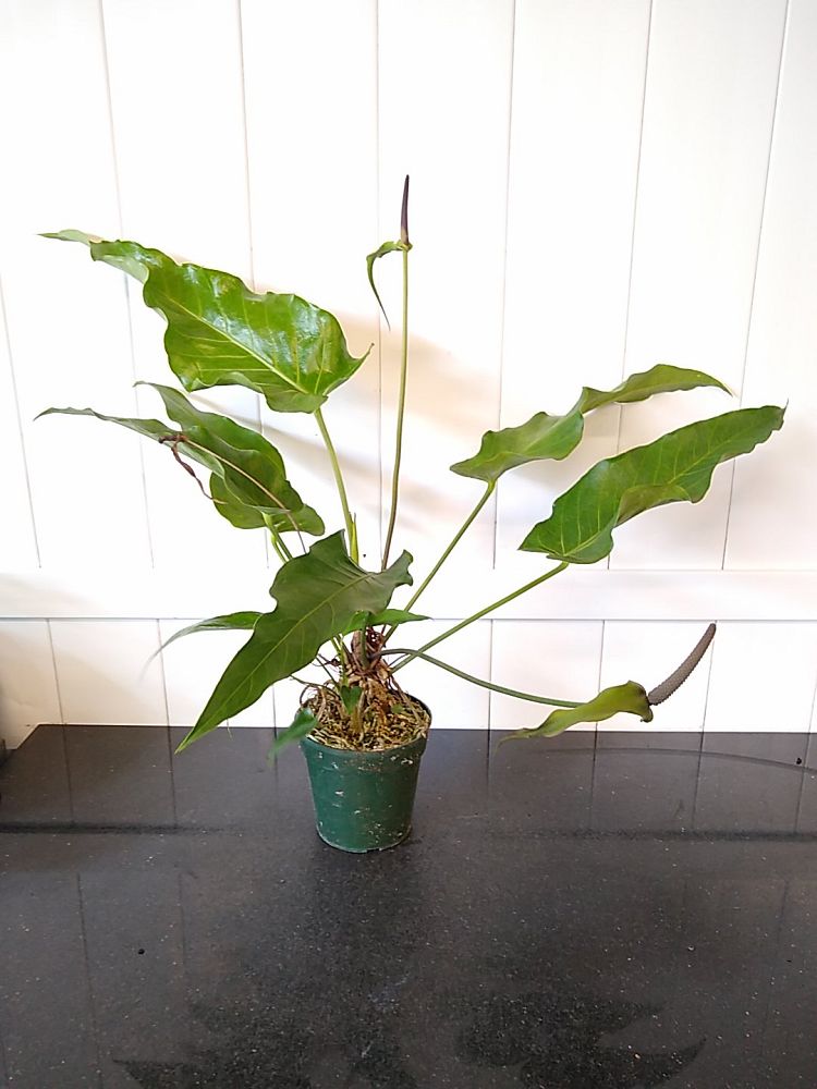 This everblooming Anthurium has large heart-shaped leaves that are nearly 3ft long when mature. The upright, structured shape of this plant makes it an excellent container plant as well as a landscape focal point in the garden. The flowers are elongated with attractive hues of maroon and green. The Big Splash anthurium is a hybrid between the Spectible X Watermaliense and is extremely rare and very hard to find in cultivation.
