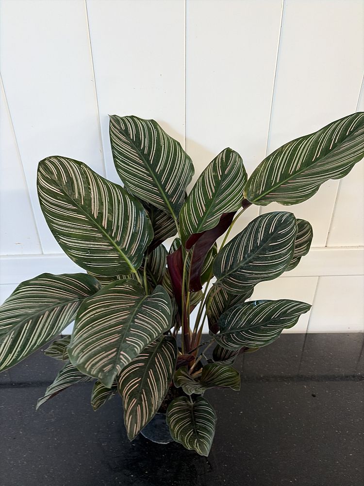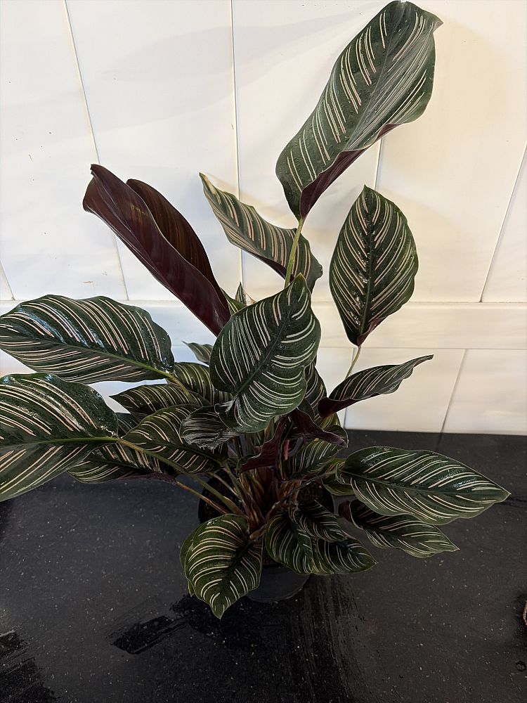 Native to South American rainforests, the Pin Stripe Calathea thrives when you keep it true to its natural habitat: no direct sunlight, high humidity and no exposure to cold. For best results, water regularly and keep your Pin Stripe moist, but not wet or saturated. You may want to mist the leaves twice weekly. Make sure to keep the Pin Stripe away from cold drafts and sudden temperature changes. The higher humidity in a kitchen or bath is a good spot for the plant if you’re keeping it indoors. It is possible to keep the Pin Stripe outdoors, especially on patios, porches or decks. It will add amazing hues to beds and borders.