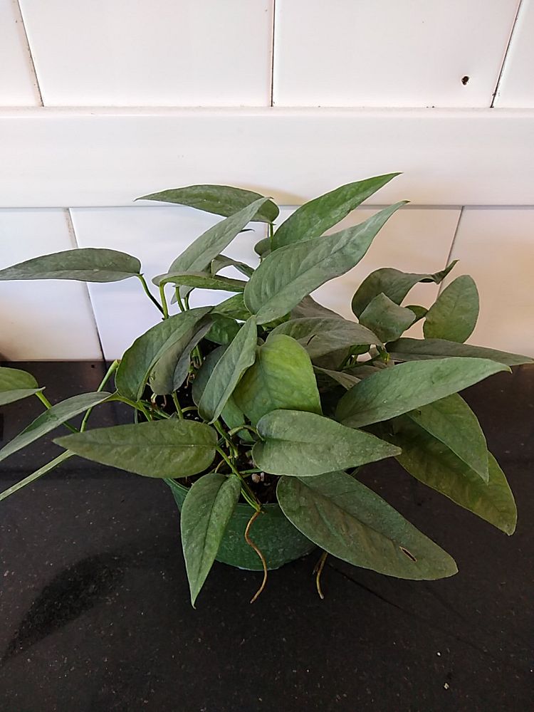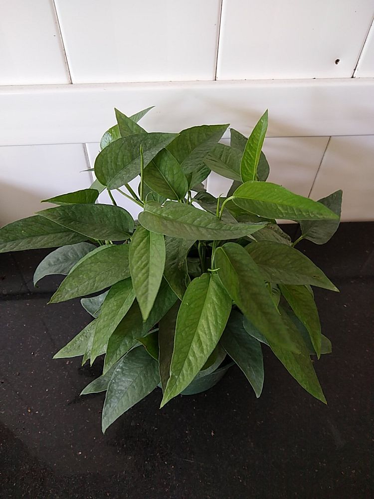 This is because the pothos vine is long, trailing, and heart-shaped, assuming the shape of an arrow. The leaf striations can sometimes have white, pale green, or yellow undertones. A mature-sized, large pothos can reach a length of up to 40 ft and is 3 to 6 feet in width.