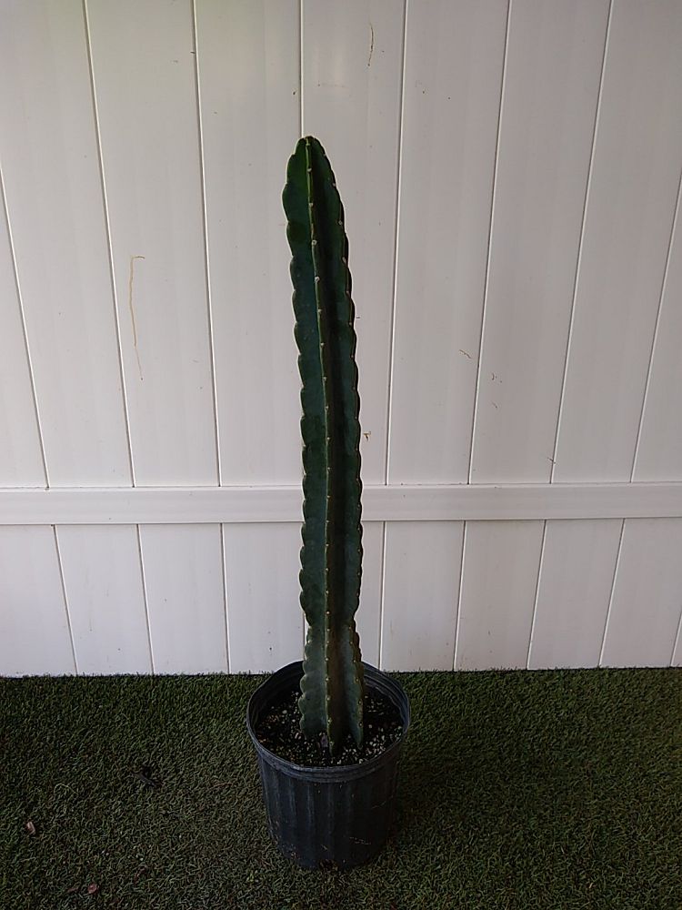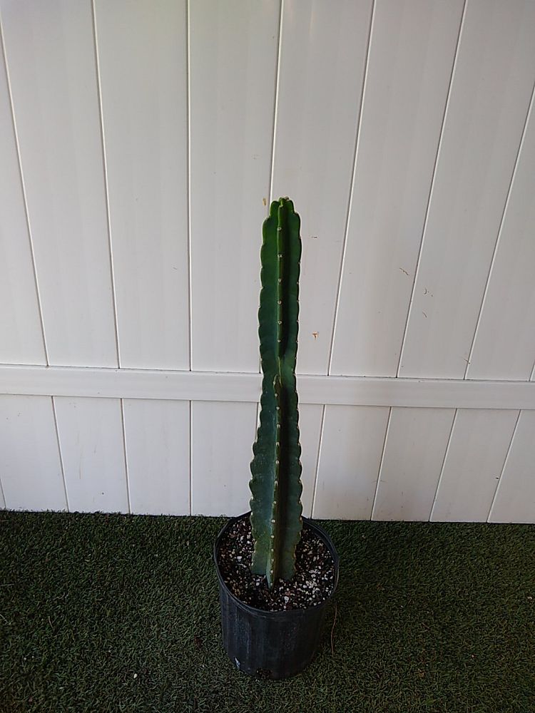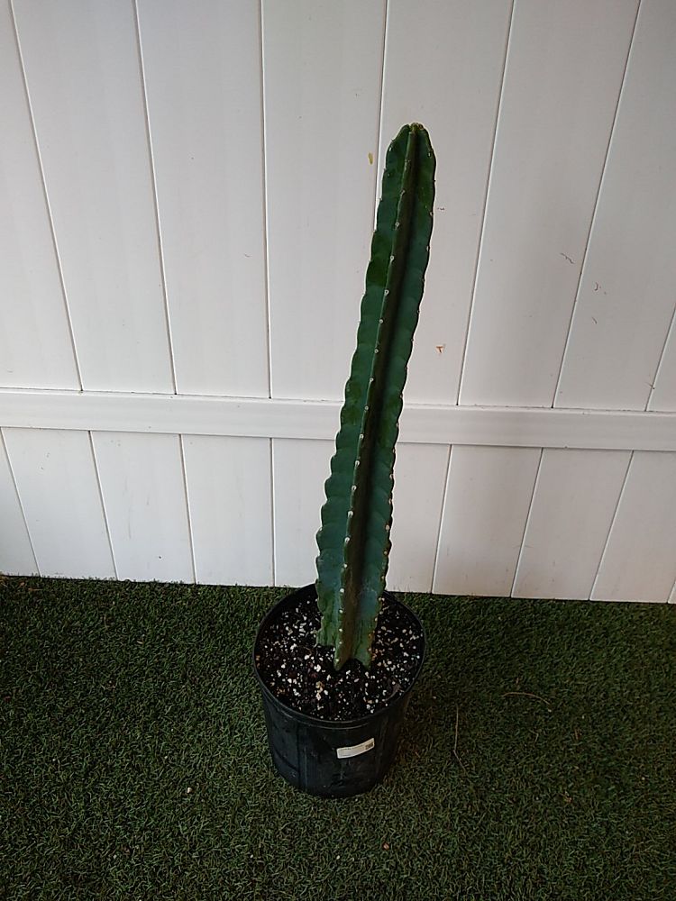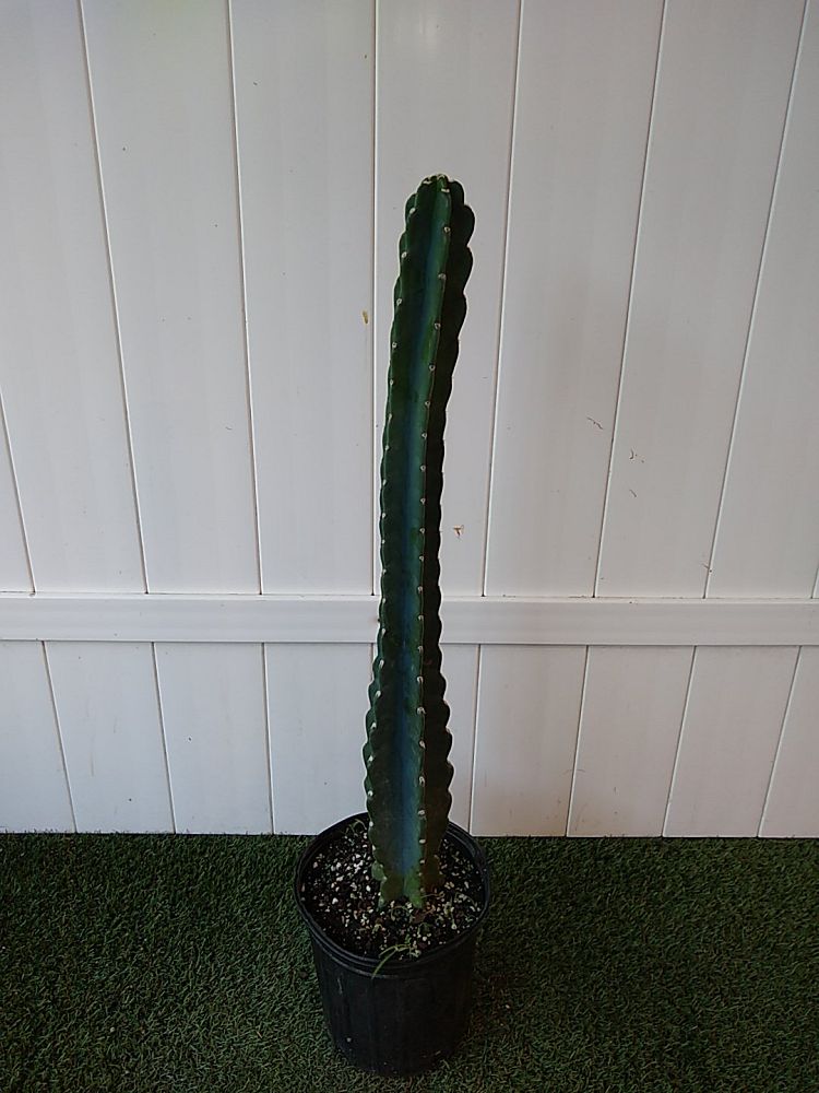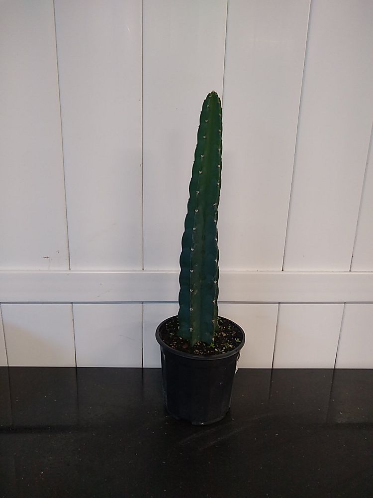 Overview: Cereus jamacaru, commonly known as the Cuddly Cactus because of the absence of sharp spines, is a striking cactus native to the arid regions of Brazil. This majestic plant can grow up to 30 feet tall in its natural habitat, though it typically reaches 6-10 feet when cultivated indoors. Its tall, columnar structure is adorned with thick, blue-green stems that have prominent ribs, creating a bold and architectural presence.