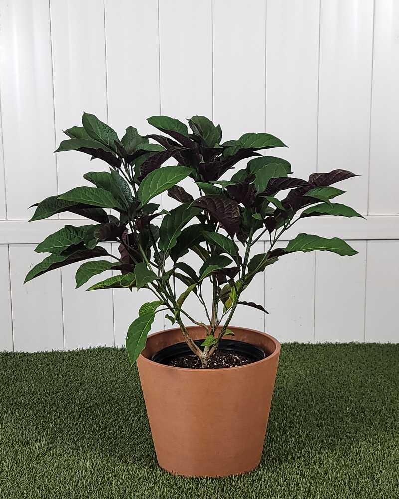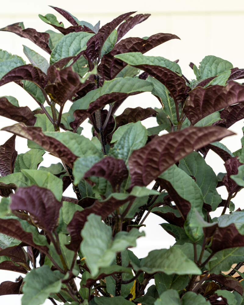 Overview: Starburst Clerodendrum, also known as Clerodendrum quadriloculare or Shooting Star, is an eye-catching shrub native to the Philippines and New Guinea. This tropical beauty features large, glossy green leaves with striking purple undersides, creating a stunning contrast that adds visual interest year-round. During the cooler months, it produces clusters of long, tubular white flowers with pinkish-purple tips, resembling bursting stars, hence its common name.