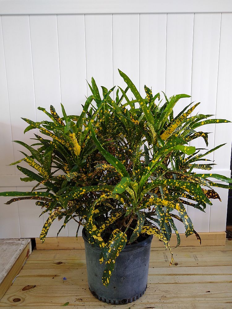 The Codiaeum variegatum ‘Eleanor Roosevelt’, commonly known as the Croton ‘Eleanor Roosevelt’, is a distinctively elegant and colorful addition to any plant collection. This variety, originating from the tropical climates of Southeast Asia, Australia, and the Pacific Islands, is renowned for its slender and elongated leaves, which create a striking visual appeal.