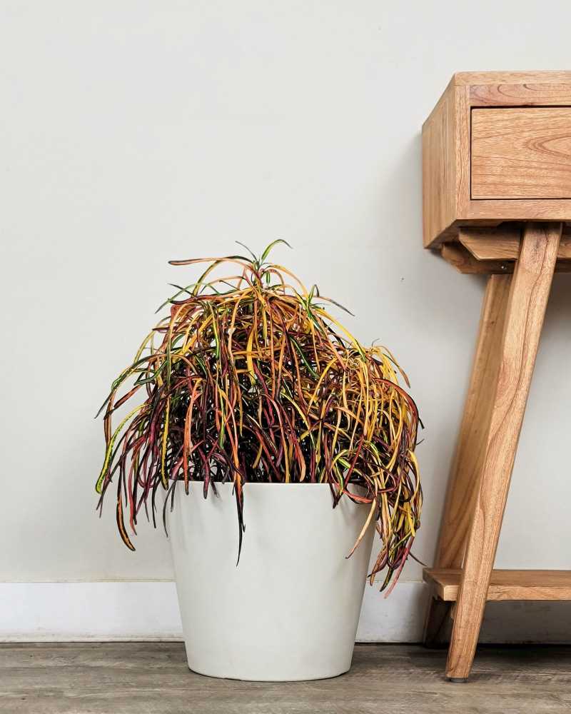 ‘Zanzibar’ features narrow leaves that are a tapestry of bright greens, yellows, reds, and even purples, creating a visually stimulating display. The intense colors and the fine, almost feather-like appearance of the leaves make it a captivating choice for adding texture and color to indoor spaces.