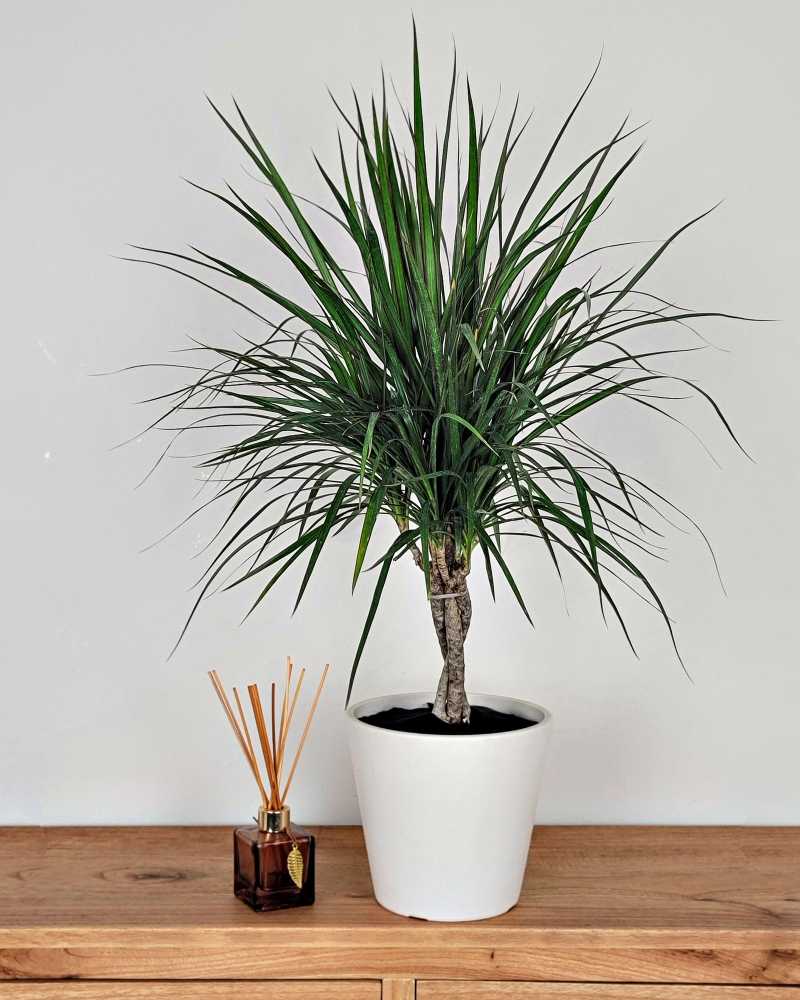 Dragon Trees thrive in average household humidity levels but appreciate a bit of extra humidity, especially in drier climates or during winter when indoor air tends to be dry. You can increase humidity by placing a humidifier nearby, misting the leaves regularly, or using a pebble tray with water.
