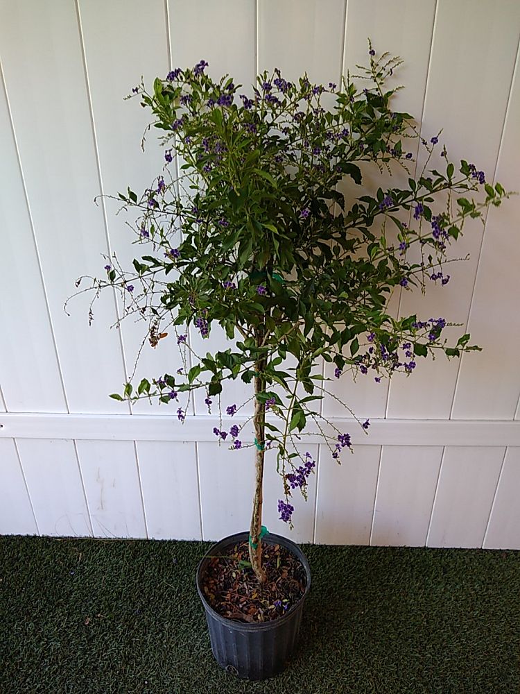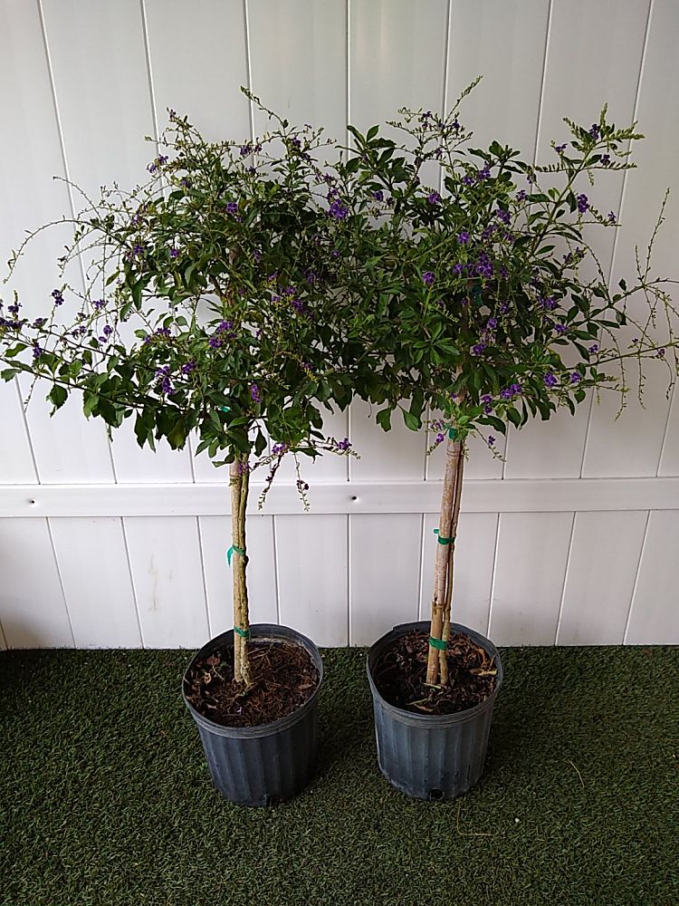 Overview: Duranta erecta ‘Sapphire Showers’ is a beautiful flowering shrub that is native to South America, but now grows in many parts of the world. It is known for its striking blue-purple flowers that bloom in clusters during the spring and summer months. The flowers are followed by small, yellow fruit that are attractive to birds. ‘Sapphire Showers’ grows quickly and can reach a height of up to 20 feet, making it a great choice for creating a privacy screen or adding vertical interest to a garden. This shrub prefers full sun to partial shade and well-draining soil. It is also drought-tolerant once established. Overall, Duranta erecta ‘Sapphire Showers’ is a beautiful and easy-to-care-for plant that adds a touch of tropical beauty to any landscape.