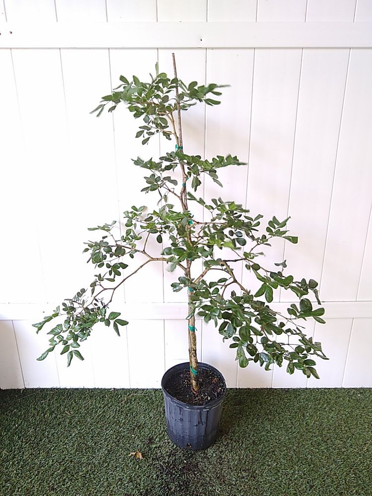 Slow growing, this broadleaf evergreen is available as a tree or a shrub. Seen most often in the 9 to 12 ft. range, it forms a dense rounded canopy. The Lignum Vitae shows off star-shaped 5-petaled blue flowers in clusters that bloom throughout the year. The flowers are followed by small, heart-shaped orange berries. The Lignum Vitae requires full to partial sun, and is drought tolerant, once established.