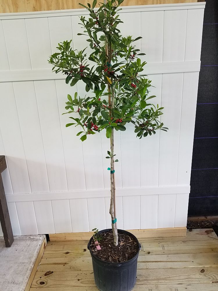 The Dahoon Holly is usually seen at a height of 20 to 30 ft., with an 8 to 12 ft. spread. Its shiny dark evergreen leaves are accented by greenish-white flowers.