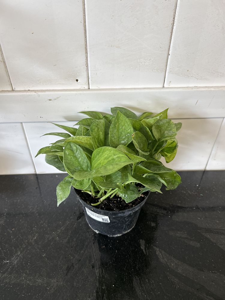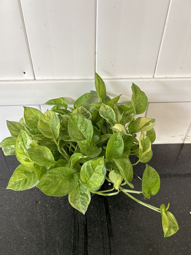 This is because the pothos vine is long, trailing, and heart-shaped, assuming the shape of an arrow. The leaf striations can sometimes have white, pale green, or yellow undertones. A mature-sized, large pothos can reach a length of up to 40 ft and is 3 to 6 feet in width.