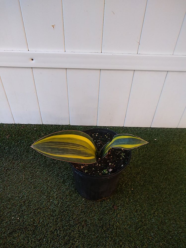 Overview: The Sansevieria masoniana ‘Variegated Whale Fin’ is a striking and robust houseplant, famed for its uniquely shaped, large leaves that resemble a whale’s fin. This variegated cultivar showcases broad, upright leaves with a blend of deep green and creamy yellow stripes, adding an eye-catching element to any indoor space. Growing up to 3-4 feet tall, each leaf is a statement piece in itself, making it a perfect focal point for modern and minimalist interiors.