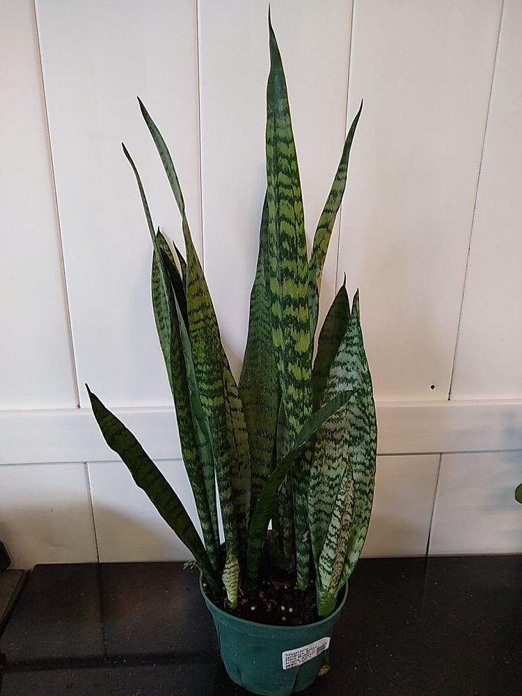 This plant has darker leaves with interesting patterns. All three arrived in good condition. I wanted some carefree green around the house. NASA says Sansevieria are good for the indoor air!